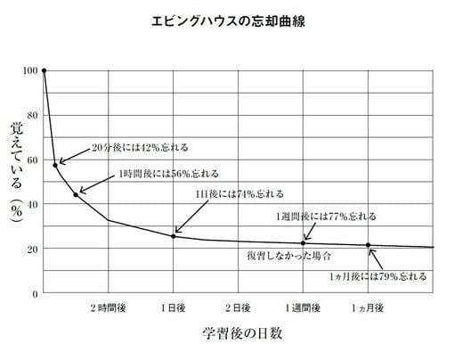 エビングハウスの忘却曲線というのは、ドイツの心理学者だったエビングハウス氏が無意味な言葉の丸暗記から見いだした「忘却は覚えた直後に急速に進む」という法則で、かれの実験によると、人は暗記した後、20分後には42%を忘れ、1時間後には56%を忘れ、1日後には74%を忘れる。1週間後には77%を忘れ、1カ月後には79%を忘れるという。