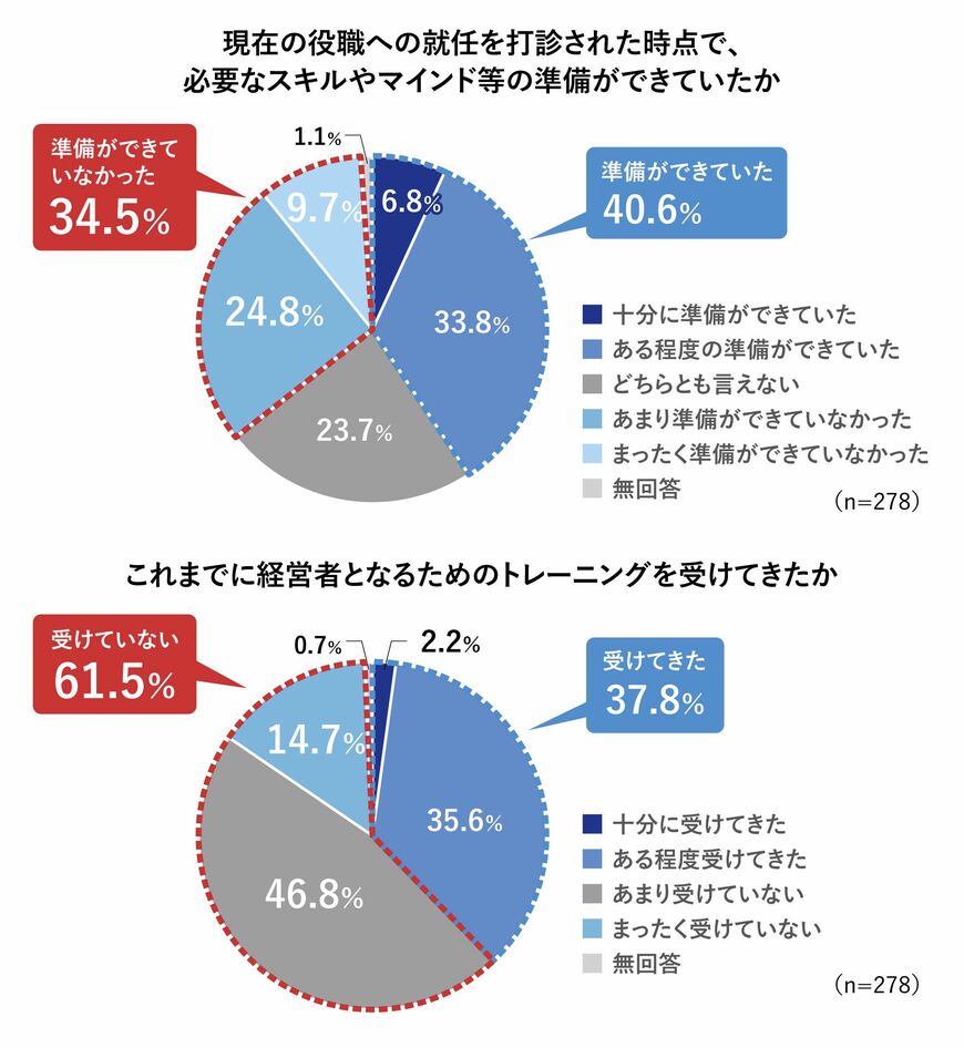経営者を育成するためには、こうしたギャップを埋める必要があるのだが、多くの日本企業では、準備が不十分なまま経営者になるケースが少なくない。実際、同調査によると、現在の役職への就任を打診された時点で「準備ができていた」と答えた人は半数以下の40.6%にとどまり、「これまでに経営者となるためのトレーニングを受けていない」と答えた人は61.5%に上った。