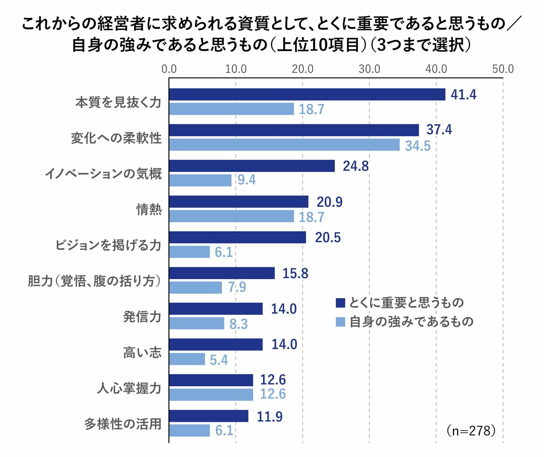 同調査では「これからの経営者に求められる資質」と同様に、「自身の強みであると思う項目」についても尋ねている。その結果、「変化への柔軟性」(34.5%)は、求められる資質と同水準だが、「本質を見抜く力」(18.7%)や「イノベーションの気概」(9.4%)には大きなギャップが見られた。