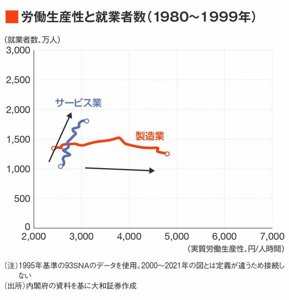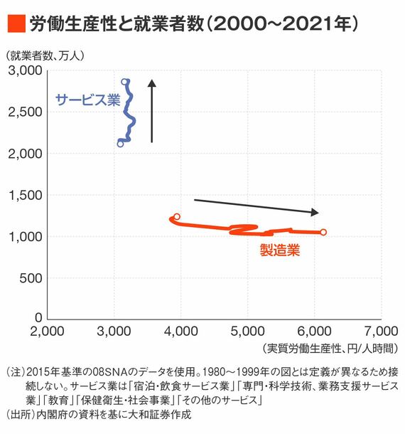 全体として労働生産性(=賃金の多い)が高い製造業と労働生産性が低いサービス業における労働生産性と就業者数の変化を見ると、1980年以降では生産性の高い製造業の就業者数が増加せず、生産性の低いサービス業の就業者数が増加してきたことがわかる。