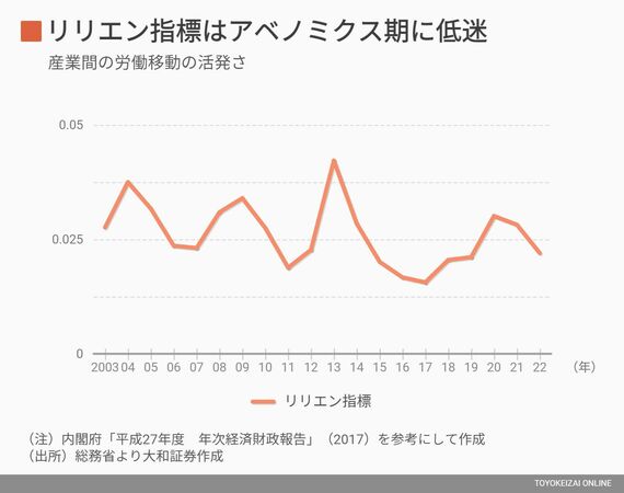2003年以降のリリエン指標を確認すると、積極的な金融・財政政策が実行されたアベノミクス期において、リリエン指標はむしろ低迷していた。金融政策によって社会的ニーズに逆らうような労働移動を促すこと自体が容易ではないといえよう。