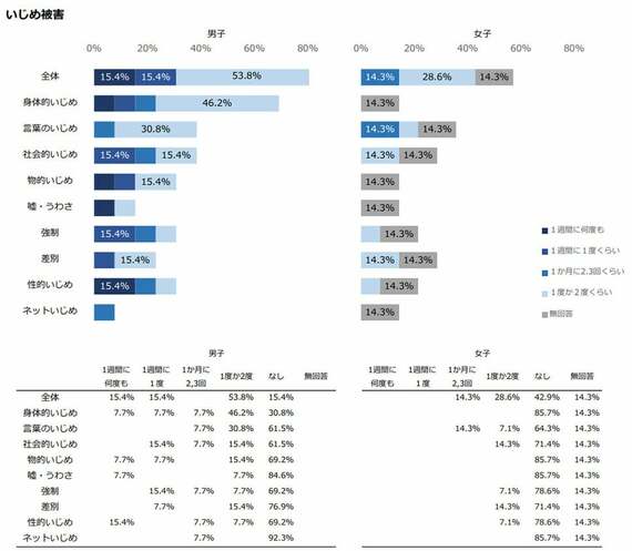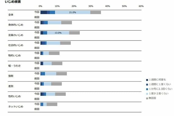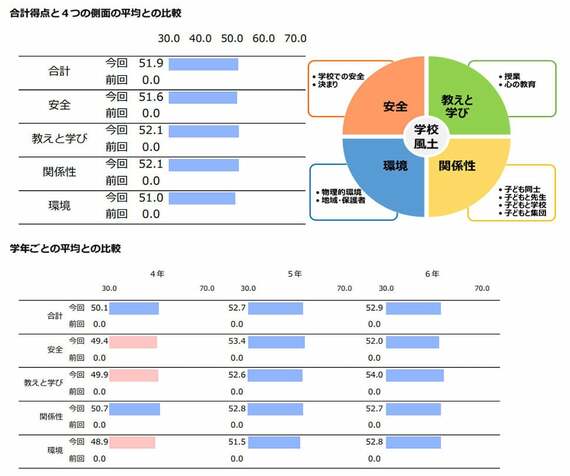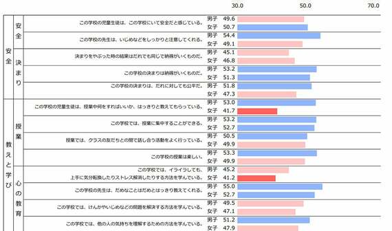 この調査は、いじめ被害に関する9つの質問(いじめ尺度)と、「安全・教えと学び・関係性・環境」の4つの側面に関する32問(学校風土尺度)で構成され、児童生徒は無記名で回答するのが特徴だ。2019年から10カ所において延べ2万6000人以上に対して実施してきた。