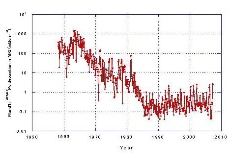 60年代以前のフォールアウト量は現在までの累積の9割を占めており、現在観測されているプルトニウムから受けている被曝量のほとんどは、過去の大気圏内核実験によるものといえる。