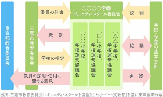 三鷹市のこのような小・中一貫教育は、コミュニティ・スクールが有機的に機能しているからこそ成り立っていると言っても過言ではない。三鷹市では、全学園に学園単位の学校運営協議会である「コミュニティ・スクール委員会」を設置している。