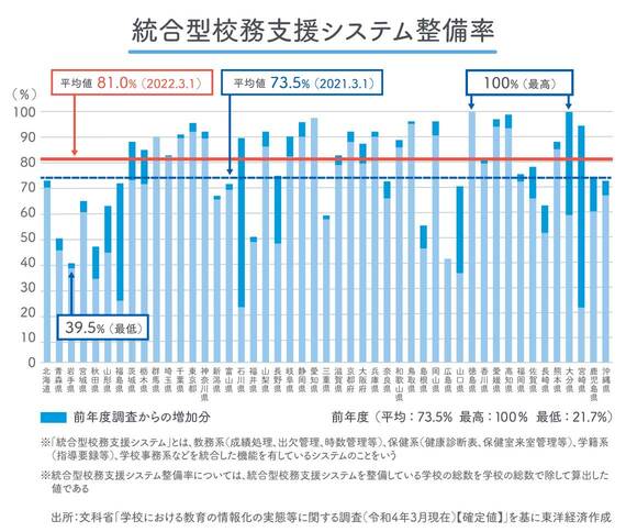 ・校務支援システムを導入していない自治体が一部にあり、児童生徒情報など同じ情報を何度も入力、転記するなど、非効率(文科省調査によると、統合型校務支援システムで情報管理している学校は平均約81%で、都道府県差も大きい)。