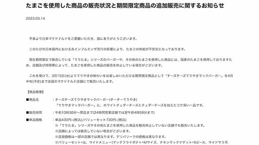 だが、そんな気合の入った「てりたま」販売開始のプレスリリースから、わずか2週間後。一転して卵不足によって、「一部での販売休止」を知らせるプレスリリースを出すことになる。しかし、このプレスリリースが「特異」なのだ。