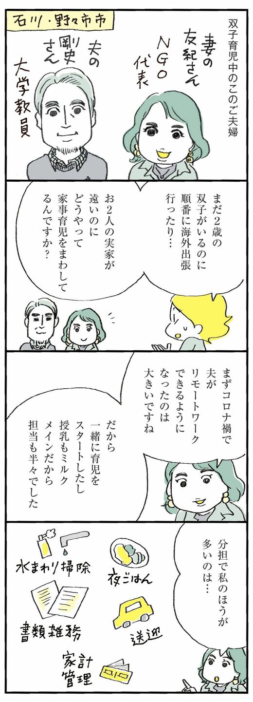 数回に分けて、石川県在住のある夫婦の育児生活を紹介しています。南極や砂漠などの極地マラソンを完走してきた夫、フィリピン支援団体の代表を務める妻、パワフルに共働きをしつつ、夫婦仲良く双子を育てるヒケツとは?