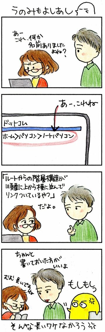 さて、悩んでいる新人さんに、通りかかった先輩が、教えてあげているようです。「この名前は、ルートからの階層構造が順番に上から横に並んでリンクついているやつっていうんだよ」。