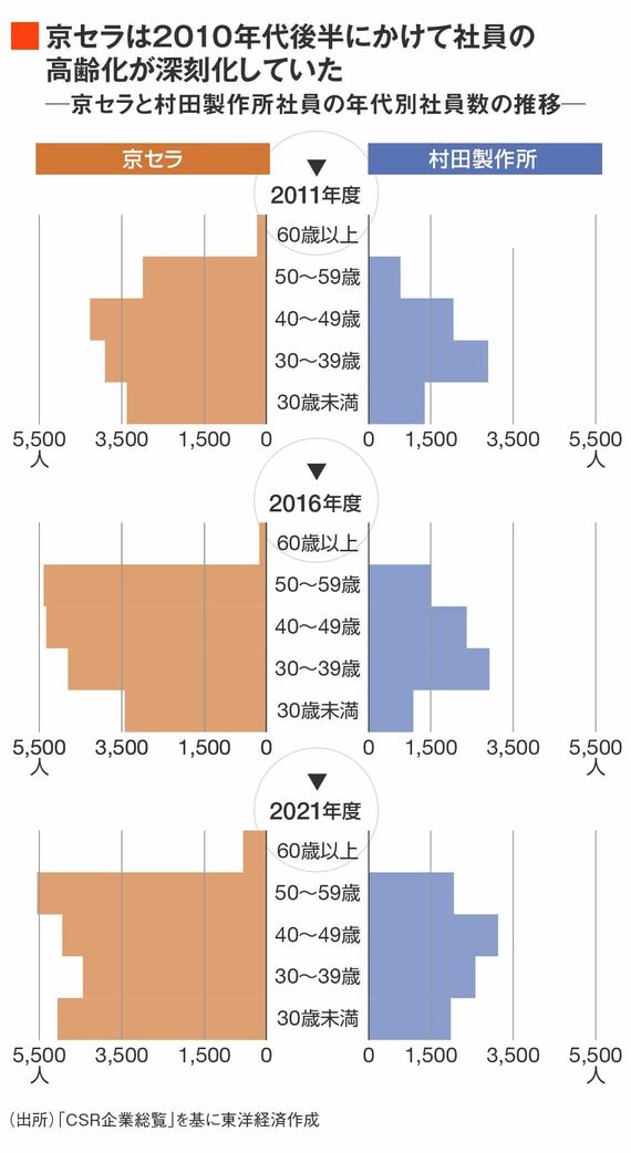 東洋経済新報社が発行する『CSR企業総覧』を基に、2011年から5年おきに、京セラとライバルの村田製作所における社員の年齢別分布(単体)を示した。徐々に社員の高齢化が進んでいることが見て取れる。高齢化が進むと、次世代の育成が進まなくなることも多い。
