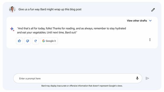 バードが真っ先に伝えてくるのは、自分は間違いを犯すということだ。ページの上部にはこんなメッセージが掲げられている。「私はバード、クリエイティブで役に立つ、あなたの協力者です。私には限界があり、つねに正しいとは限りませんが、あなたのフィードバックが私の改善に役立ちます」。