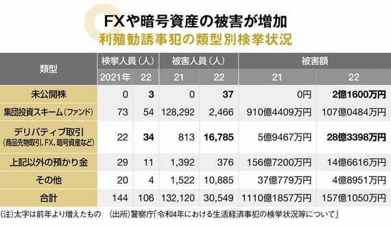 2022年に検挙された被害額は約157億円で、2021年の約1100億円から大きく減った。だが、ここしばらくは利殖勧誘事犯の被害が増えるおそれがある。
