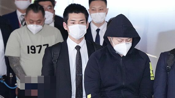 広域強盗事件の指示役「ルフィ」ではないかと疑われ、フィリピンから強制送還された渡辺優樹容疑者(前列右)と、小島智信容疑者(中列左)(写真:日刊スポーツ/アフロ)