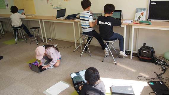 ヒロックには固定席がない。自由進度学習の時も、壁際のデスクで集中している子、ソファーで仲良しの子と身を寄せ合って座る子、寝転がってパソコンを操作する子、数人でテーブルを囲む子とさまざまだ。行き来も自由なので、いつの間にか移動している子もいる。