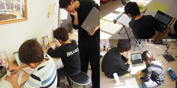 この日の午前中は、自由進度学習の次にゲストティーチャーが授業を行う「自由」、その後に「思考と言語」という時間割だった。「思考と言語」では架空の物語を作り、完成させた物語を互いに読み合ってフィードバックをしていた。ランチは「外で食べたい」という子どもたちの提案を受けて、シェルパも一緒に全員で元気に砧公園に出かけていった。