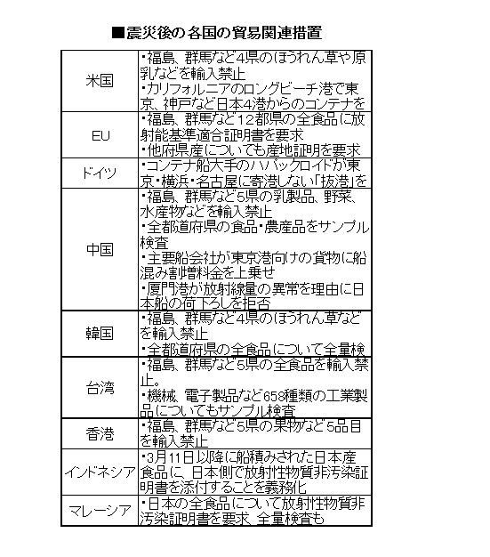 また、中国の主要船会社が東京港向けの貨物に対し、船混み割増料金(PCS)の上乗せを始めたという情報も出ている。業界関係者によると、外資船舶会社が東日本への寄港をちゅうちょするのは、乗組員の放射能汚染を不安視しているだけでなく、輪番停電が港湾の物流倉庫にも影響し食品などの荷が適正に保管されないと懸念している理由もあるという。