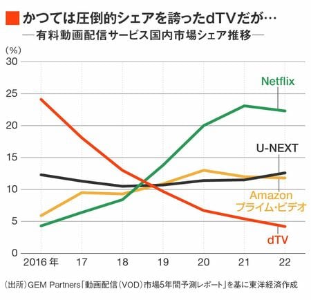 実際、動画配信サービス市場におけるdTVのシェアは、この数年で急速に低下していた。調査会社・GEM Partnersによれば、2016年時点の国内シェアでは24.1%と圧倒的1位を誇っていたdTVだが、2022年には4.2%にまで落としている。同期間で一気にシェアを広げたNetflixと、くっきり明暗が分かれた形だ。