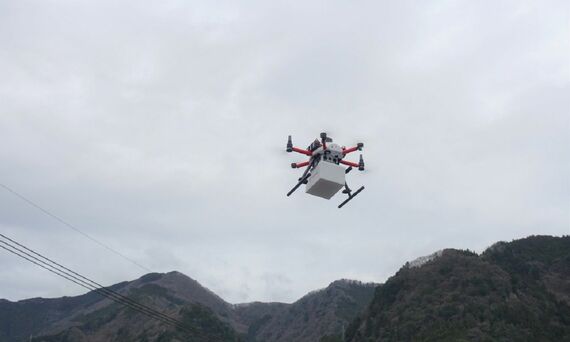 草刈り機のような大きな音を響かせながら、ドローンは東京都・奥多摩郵便局の屋上を離陸した。垂直に数十メートル上昇した後、配送先に向け、山奥へと消えていった。