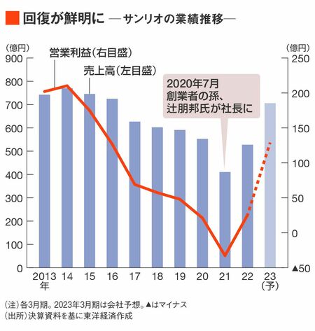 サンリオは3月16日、2023年3月期第3四半期決算の公表と併せて、通期の業績予想を上方修正した。売上高は前期比34%増の706億円、営業利益に至っては同5倍超の129億円と、大幅な増収増益となる見込みだ。