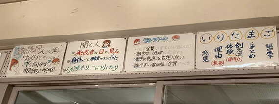 「発表者は、下を向かず、大きな声でゆっくりと話し、話の根拠を明確にする」「伝わりやすい順番は、い(意見)・り(理由)・た(例えば)・ま(まとめ)・ご(誤字脱字)」などの「二中・話し合いのルール」も作り、20年度初めに共有した。そのうえで、話し合い活動では「まずは自分で考える→小集団で話し合う→全体で話し合う→自分の意見をまとめる」という構造を意識して授業をつくるようにした。