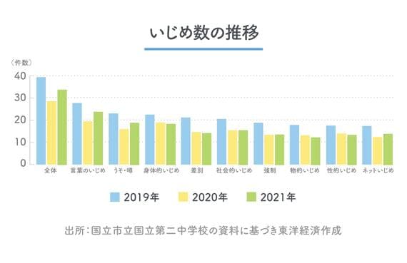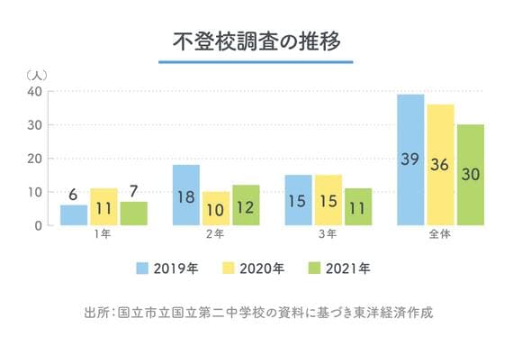 文科省「児童生徒の問題行動・不登校等生徒指導上の諸課題に関する調査」においても、二中では不登校の生徒数もいじめの件数も、減少傾向を示した。いじめに関しては重大事態など深刻なケースは21年度以降なくなったという。3年間の授業改善は、一定の成果があったと考えていいだろう。