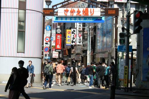 さかえ通りは、車1台が通れる程度の狭い通りであるが、やはり学生向けの安価な飲食店が集まっている。高田馬場における人気スポットの1つだ。