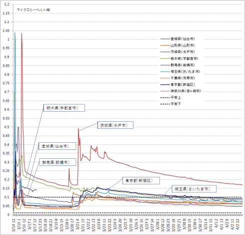 3月15~16日に各地で非常に高い放射線量が計測された後、いったん線量は低下、