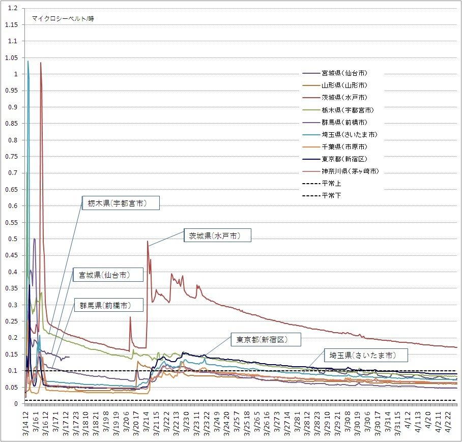 その後は、放射線量は各地ともほぼ一貫して低下を続けていることから、15日以降は大気中に新しい放射性物質が大量に放出されてはいないもようだ。