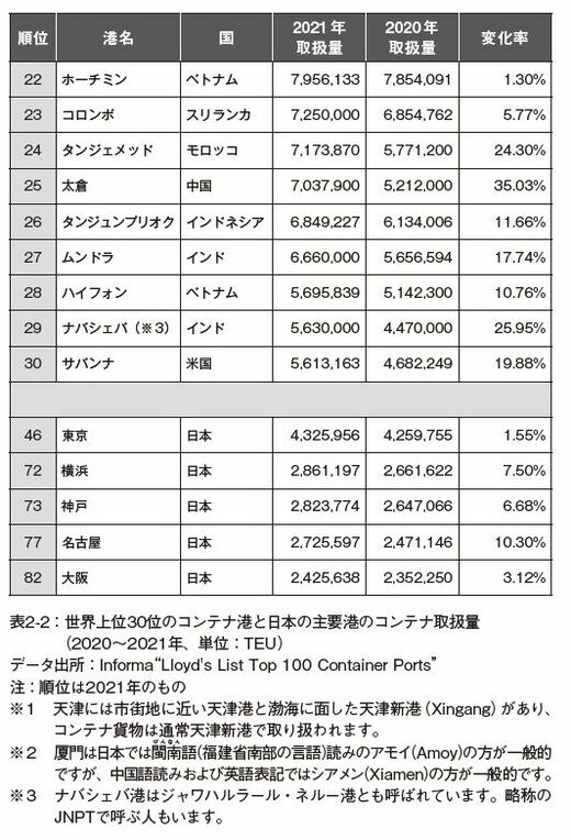 表を見るとわかるように、特筆すべきこととして、上位7港それぞれの取扱量は、日本全体のコンテナ取扱量2246万TEU(2021年)を上回っています。また、シンガポール、釜山サン、ロッテルダムを除くと取扱量で上位10位を占めているのはすべて中国の港です。