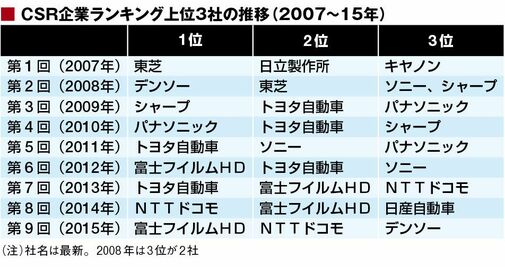 トップは3年ぶり2回目の富士フイルムホールティングス(総合得点576.4点)だった。2012年1位、2013年2位、2014年2位と常に上位を維持。トップ2回は2011年、2013年1位のトヨタ自動車に並ぶ過去最多だ。