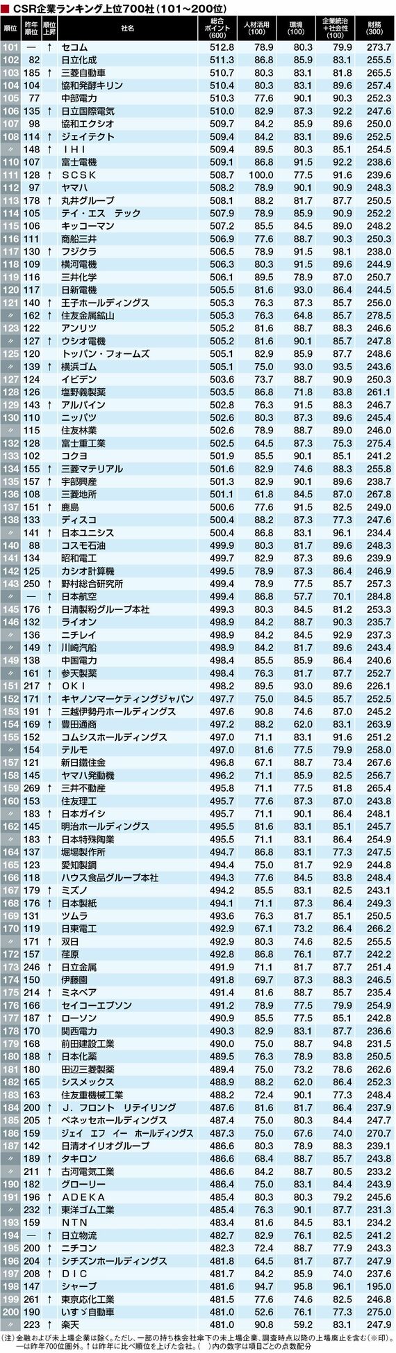 101~200位では大手百貨店が激しく争う。113位の丸井グループ(508.1点)は昨年178位から大きく順位アップ。153位三越伊勢丹ホールディングス(497.6点)、184位にJ.フロント リテイリング(487.6点)が入った。