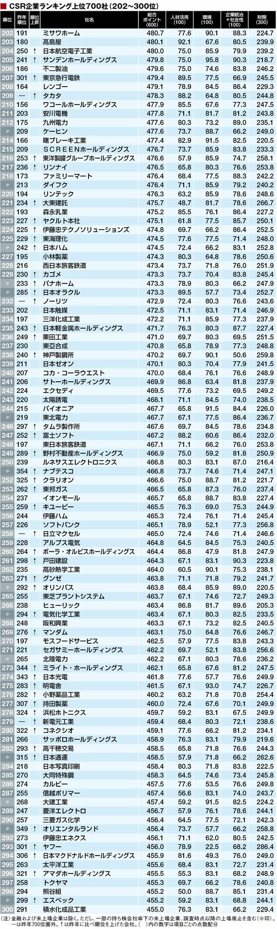 202~300位では東京急行電鉄(479.4点)が昨年301位から207位に上昇。一方でJRグループは西日本旅客鉄道(473.4点)が216位から228位、東日本旅客鉄道(467.1点)は197位から248位と大きくランクダウンした。他に、昨年354位のナブテスコ(466.8点)が250位、クラリオン(466.6点)が昨年325位から252位と大きく上昇し、来年以降のさらなる飛躍も期待できそうだ。
