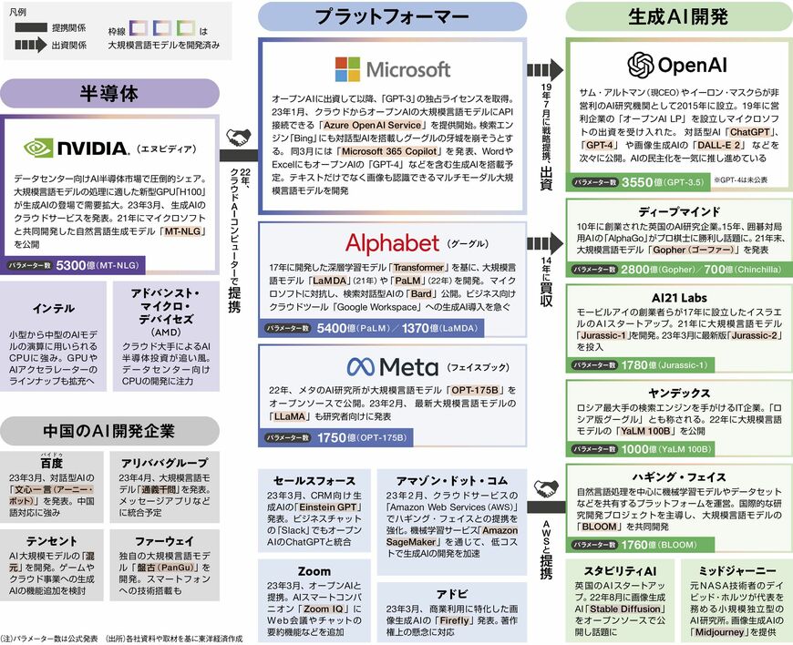 生成AIの開発・実行に不可欠なAI半導体の世界シェア8割を握るのはエヌビディアだ。マイクロソフトとは、2021年に自然言語生成モデル「MT-NLG」を共同開発、2022年にはクラウドAIコンピューターで提携しており、AI半導体の覇権を握っている。