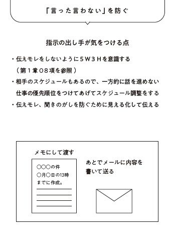 自分が指示を出して、人に仕事を依頼する場合もあります。自分が伝えたいことと、相手に伝わったことは違うという前提に立って、相手が具体的に依頼内容を理解できるように指示をします。指示の出し方がよければ、最短距離でタスクが完了し、仕事の効率もアップします。ミスを最小限に抑えることにもつながります。