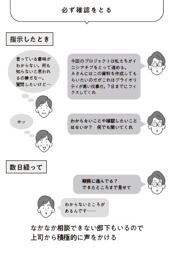 そして指示を出したからといって、そのまま放置せず、途中にも声かけをし、様子を見ていきます。指示したときには理解したつもりでも、いざやってみるとできないこともあります。「うまく進んでる?」「やってみてわからないことはない?」と声をかけ、相手がつまずいていることに早く気づけば、適切なフォローができます。放置して結局指示した仕事ができていなければ、自分も組織も困ります。できたところまで見届けてはじめて、仕事を指示したといえます。