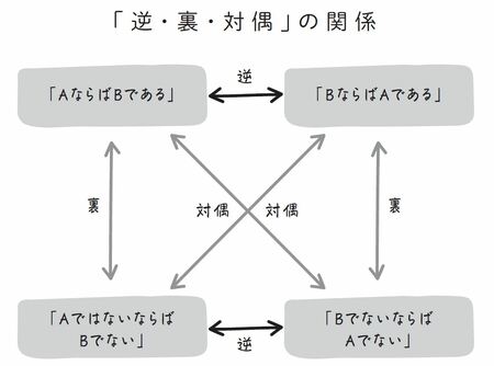 下の図のように、まず「AならばBである」という「命題」があるとします。このとき、「BならばAである」は元の命題の「逆」、「AでないならばBではない」は元の命題の「裏」、そして、「BでないならばAではない」は元の命題の「対偶」といいます。