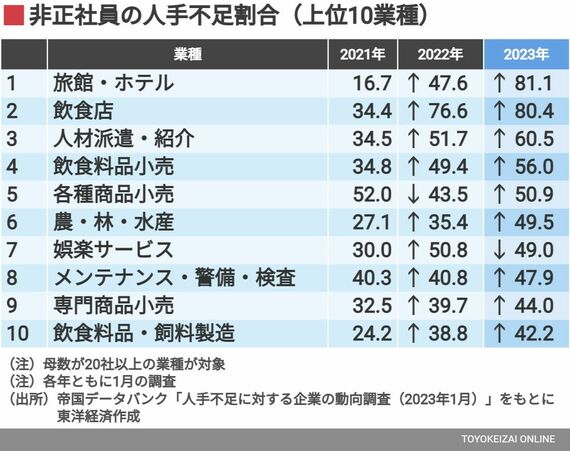 帝国データバンクが発表した1月時点の調査でも、人手不足を感じる企業の割合(非正社員)は、旅館・ホテルで81.1%、飲食店で80.4%に及んだ。全体の中でもこの2業種が群を抜いており、旅館・ホテルにいたっては過去最高の割合である。