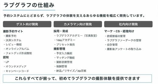 ラブグラフが展開する出張撮影サービスとカメラマンの育成事業は、予約フォームや決済システム、レビュー機能、オンラインアルバムをはじめ、サービスの大部分がITによって支えられている。