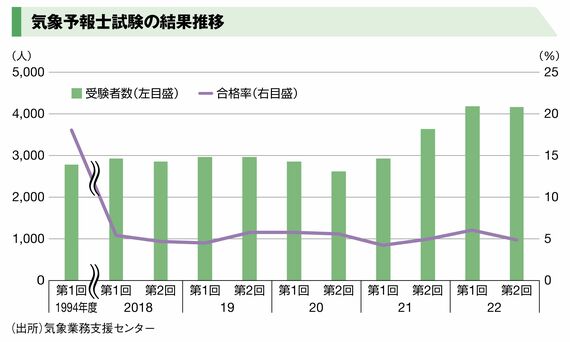 気候変動が問題になり、世界で異常気象や自然災害が多発する中、気象予報士の資格が注目されている。受験者数は2020年度第2回の2616人を底に、2022年度第2回の4166人まで拡大した。過去59回の平均合格率は5.5%と相変わらずの難関資格である。