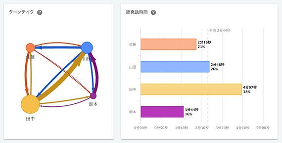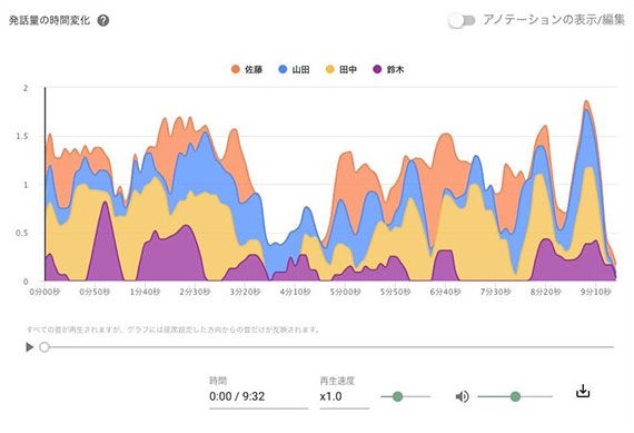 議論のデータは教育学や対話分析の知見を基に定量化しており、例えば、発言者それぞれの発話時間の総量、話し合いのやり取りのパターン(ターンテイク)、いつ誰がたくさん話したかという発話量の時間変化などを可視化している。