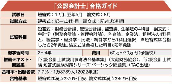 一方の論文式は、公認会計士に必要な応用力が備わっているかを評価するための試験だ。毎年8月に3日かけて行われる。試験形式は記述式。必須は「会計学(財務会計論・管理会計論)」「監査論」「企業法」「租税法」の4科目で、選択は「経営学」「経済学」「民法」「統計学」から1科目で、併せて5科目である。