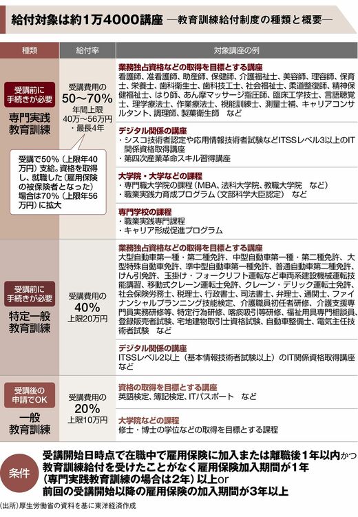 受給条件にも注意しておきたい。まず受講開始時点で雇用保険に加入中または離職後1年以内であることが必要だ。そのうえで教育訓練給付を受けたことがない人は保険加入期間が1年以上(専門実践教育訓練の場合は2年以上)、給付経験がある人は前回の受講開始から雇用保険の加入期間が3年以上経過する必要がある。