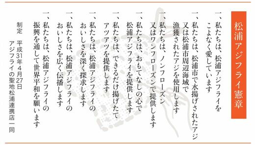 同憲章は2019年4月27日、松浦市が「アジフライの聖地」(2020年12月に商標登録)と宣言した日に制定され、松浦市で水揚げされたアジ、または松浦市周辺海域で獲れたアジを使うこと、ノンフローズンまたはワンフローズンでの提供が松浦アジフライであることなどを規定している。
