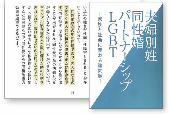 講演録には、同性愛について「後天的な精神の障害、または依存症」「同性愛行為の快感レベルが高くてなかなか抜け出すことができないのは、ギャンブル依存症の人が沢山儲けた時の快感を忘れられず、抜け出せないのと同じなのです」などと記されていた。