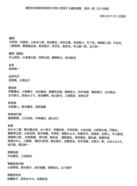 手元に「選択的夫婦別氏制度を早期に実現する議員連盟 役員一覧」(2021年7月)という資料がある。役員のうち、顧問に就いた甘利明氏や小泉進次郎氏、河野太郎氏、茂木敏充氏、副会長の小渕優子氏、幹事長の木原誠二氏、事務局長の井出庸生氏ら39人は、一方で、神政連の公約書に賛同・署名をして神政連の推薦候補にもなっていた。