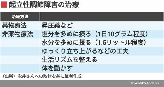 治療は、血圧を上げる薬(昇圧薬)などを用いる薬物療法と、水分摂取、塩分摂取の励行などの非薬物療法などの2本柱で行われることが多い。