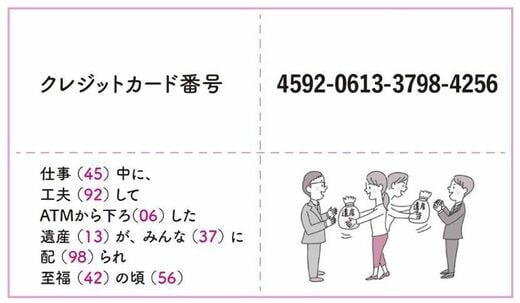 たとえば、「4592-0613-3798-4256」の場合、「仕事(45)中に、 92 (工夫)して(ATMから下ろ(06)した遺産(13)が、みんな(37)に配(98)られ至福(42)の頃(56)」となります。