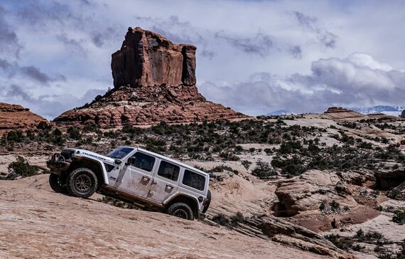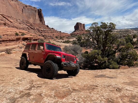 私がユタ州モアブのキャニオンランズとアーチェス、2つの国立公園とその周辺で乗ったラングラー ルビコン4xe 20th アニバーサリーエディションは、専用のリフトアップキットを組み込んで、さらに走破性を高めたモデルだ。