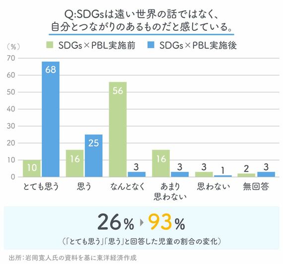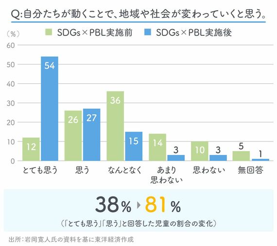 この探究学習に取り組んだ児童たちの、1年後の変化が興味深い。授業実施の前後で「自分たちが動くことで、地域や社会が変わっていくと思う」という質問に対し、「とても思う」「思う」と回答した児童が38%から81%に増加。「SDGsは遠い世界の話ではなく、自分とつながりのあるものだと感じている」という質問も、「とても思う」「思う」と回答した児童が26%から93%に増えたのだ。