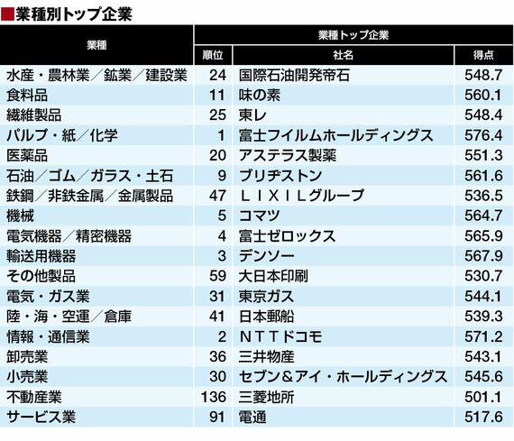 まず各業種のトップをまとめた。総合ランキングの上位企業が多いものの59位大日本印刷、136位三菱地所、91位電通はトップ50に入っていない。ただ、これらは業種による差のためで各トップ企業はCSR先進企業と判断してよい。
