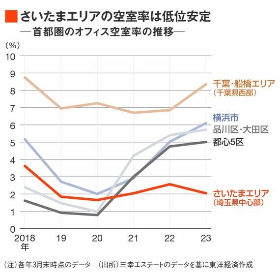 首都圏のオフィス市況に逆風が吹く中、絶好調なのが埼玉県の中心部だ。オフィス仲介大手の三幸エステートによれば、都心5区や横浜エリアはコロナ前の2019年と比べて空室率が上昇している一方で、大宮駅周辺などに代表されるさいたまエリアの空室率は低位安定している。
